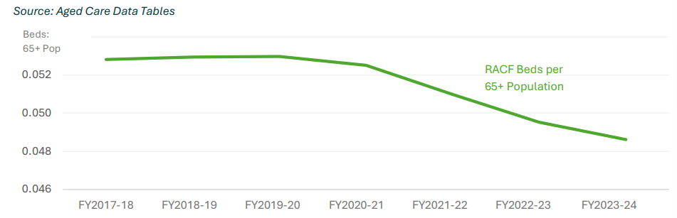 At the same time, the number of residential aged care beds per person over 65 has declined steadily over the past decade (see chart below). Duckett says the Commonwealth must take greater responsibility for ensuring timely access to aged care – including “ensuring private facilities have an incentive to take patients awaiting discharge.”