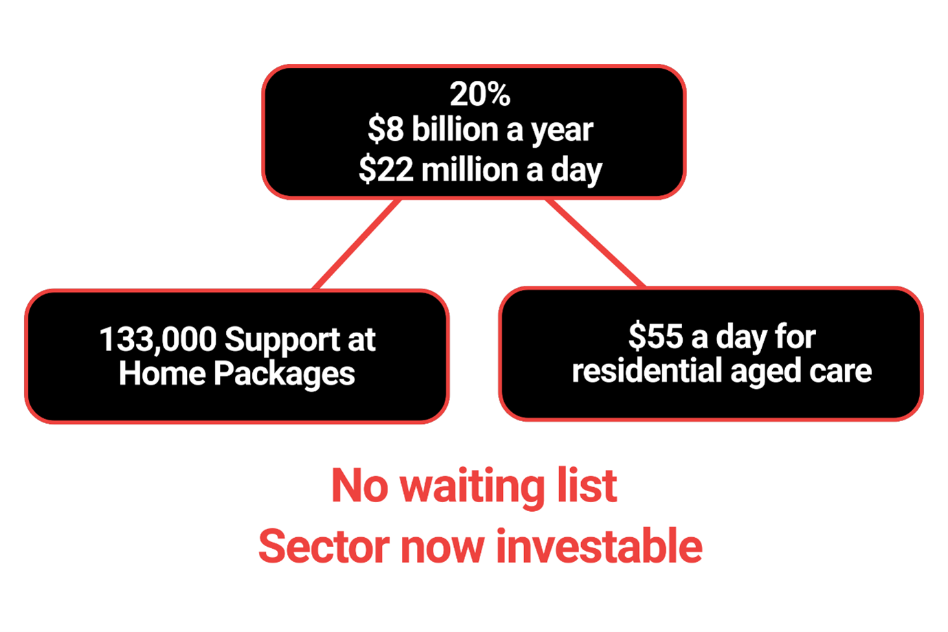 Imagine if the sector’s Plan T initiative can identify 20% savings of not only money but physical hours; it would release $4 billion to spread across Support at Home, making it viable, and residential care. For RAC operators, their $4 billion is the equivalent of $55 a day for every existing aged care bed, making the sector investible overnight, which would then deliver the 10,000 new beds a year that the country requires.