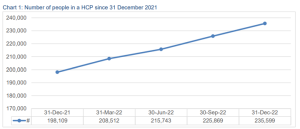 The December Quarter Home Care Packages (HCPs) Program Data Report reveals nearly 45,000 packages were released during the quarter, an average of 3,350 per week. That is an increase from the rate of 3,250 per week in the September quarter but down from the June quarter, when 3,575 packages were released weekly, on average. The number of home care providers is increasing. At 31 December 2021, there were 911 home care providers. At the end of 2022, there were 938 home care providers.