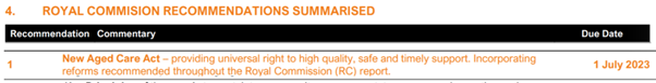 We draw readers’ attention to the dates being set by the Commissioners. Where the Government was thinking of 10 years for a transition of the aged care system, the Commissioners want a maximum of five. To drive this home, they have set a new Aged care Act to be in place within two years: