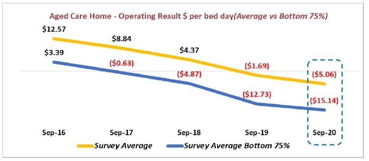This brought the average Operating Result for aged care homes down by $1,132 per bed per annum (pbpa) to a loss of $1,714 pbpa.