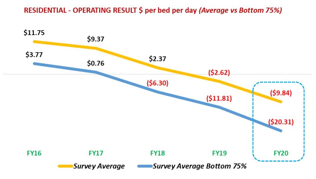 In particular, the report highlights the bottom 75% of aged care homes (835 homes) in the survey and their operating loss of $20.31 per resident per day.