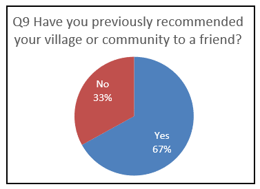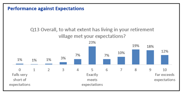 On the whole, village living also meets or exceeds expectations, with 64% of 4,300 residents indicating that their expectations have been exceeded (rating of 6-10) and a further 23% indicating their expectations have been exactly met. However, 13% of residents reported that the village living has fallen short of expectations – a flag for some underlying concerns with different aspects/irritants of village living and management.