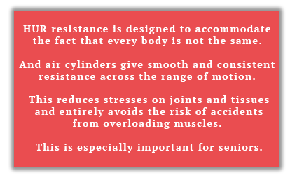 Patrick says there are number of reasons it has worked over his previous gym. The first is that HUR uses air as a counterforce rather than steel weights. It was created for complex rehabilitation and older people. The resistance can be increased and decreased by as little as 100 grams.