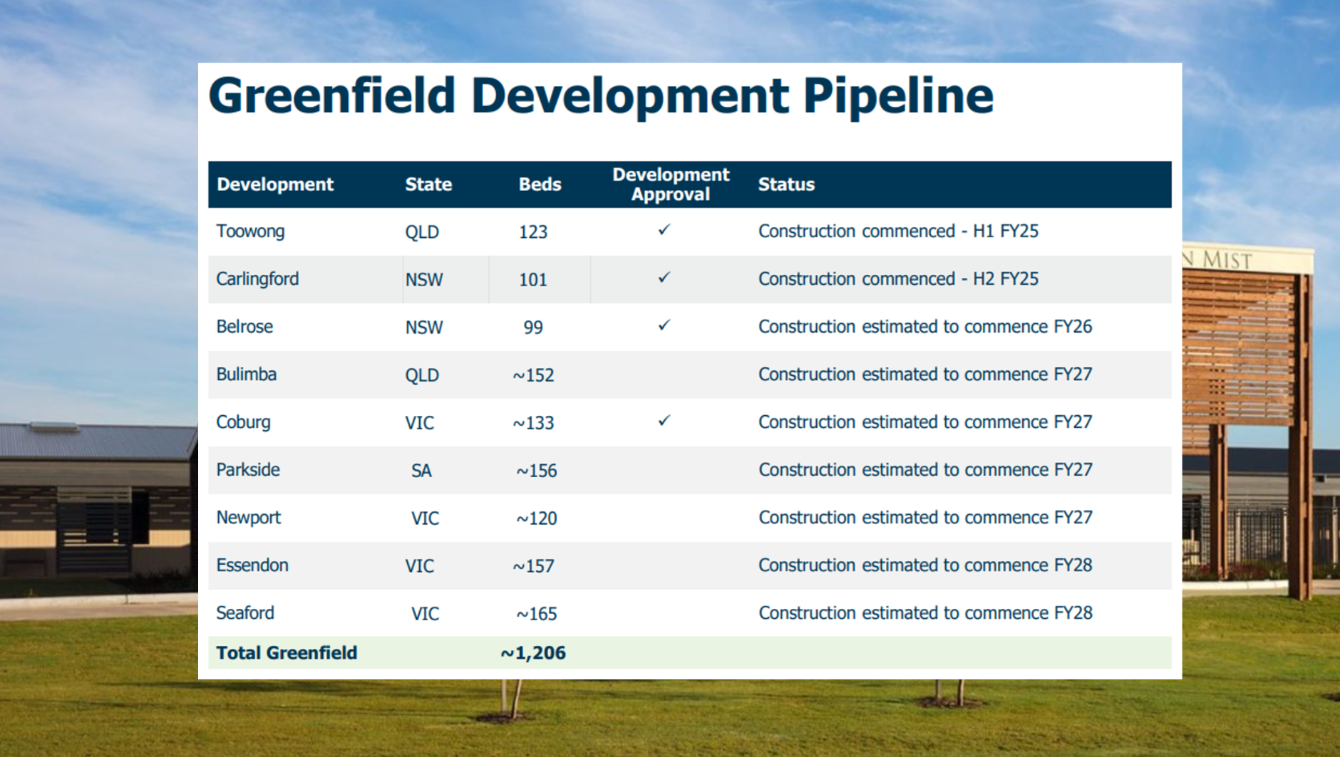 The ASX- listed operator said construction is underway at Toowong (QLD) and Carlingford (NSW), with work at Belrose (NSW) expected to begin in 2026. Regis has nine development sites, after acquiring five in 2024-25.