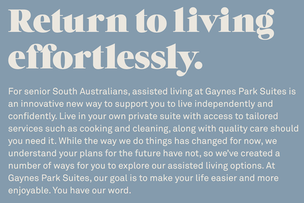 It is based around groups of 16 residents. This project demonstrates that you can deliver a small home model within the current funding structures. The outcomes for individual residents have been significant and research continues to be done to map out these benefits. If we consider one of the residents there called “Margaret”. She is not only enjoying a more comfortable living environment, but she has also seen an overall improvement to her quality of life; her family are staying longer when they visit. Margaret attributes this to the non-clinical feel of Gaynes Park Manor. The grandkids have told their parents they don’t mind visiting now, because Granny isn’t living in a hospital anymore.