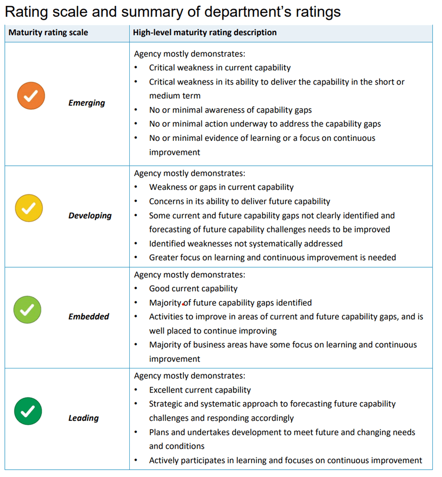 Across its ‘maturity-level’ rating, the Department was found to be ‘Developing’ across 38 out of 50 categories. In 12 areas, its capability was rated as ‘Embedded’.