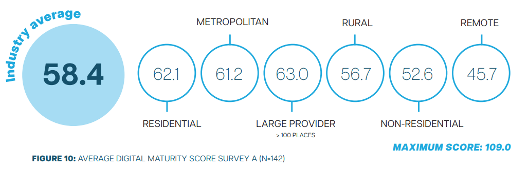 They found both strength and weakness in the digital maturity of Australia's aged care providers, measured on a scale of 0 to 6, as shown in the table at the top of this article. Cybersecurity measures, communication technology, and digital leadership at a board level all scored relatively well. However, a significant lack of innovation, low usage of predictive analytics, and almost zero client access of digital systems were weaknesses revealed by the surveys.