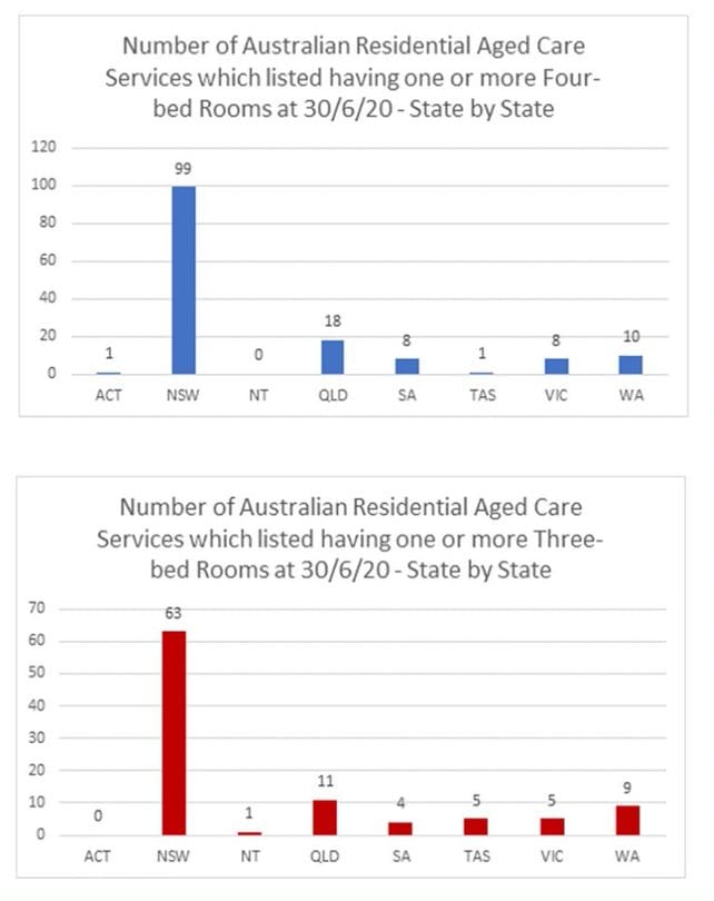 Interestingly, the data – sourced from My Aged Care – also shows there is still a large number of three- and four-bed rooms – particularly in NSW.
