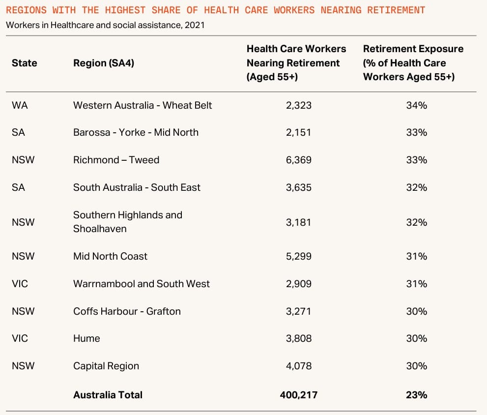 Across Australia, around 23% of the health care and social assistance workforce was aged 55 or older in 2021, meaning many workers will retire during the same period demand for care rises.