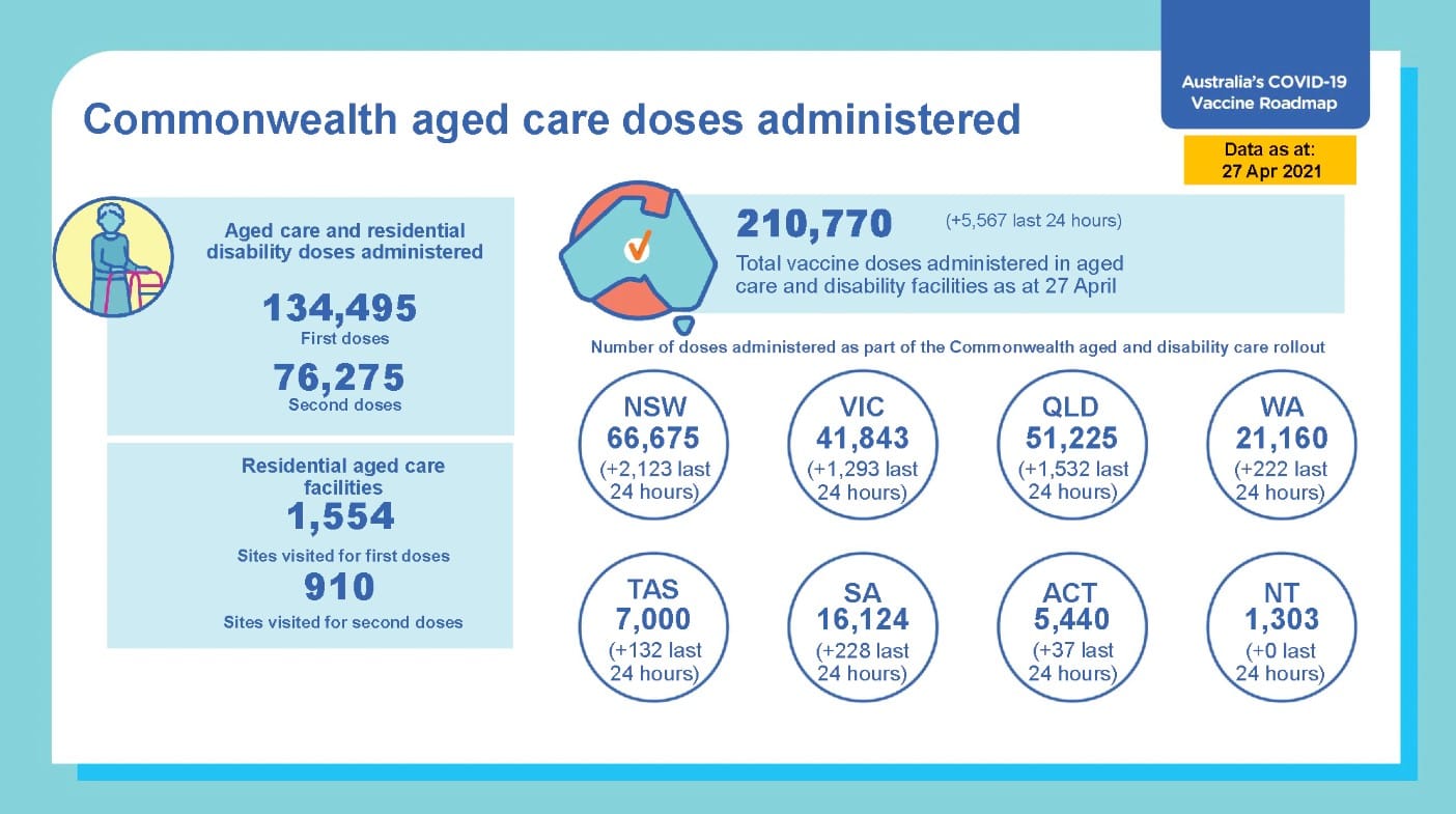 On 27 April, the Health Department’s Vaccine Operations Centre (VOC) said 210,770 vaccine doses have been administered in aged and disability facilities, with 5,567 in the past 24 hours.
