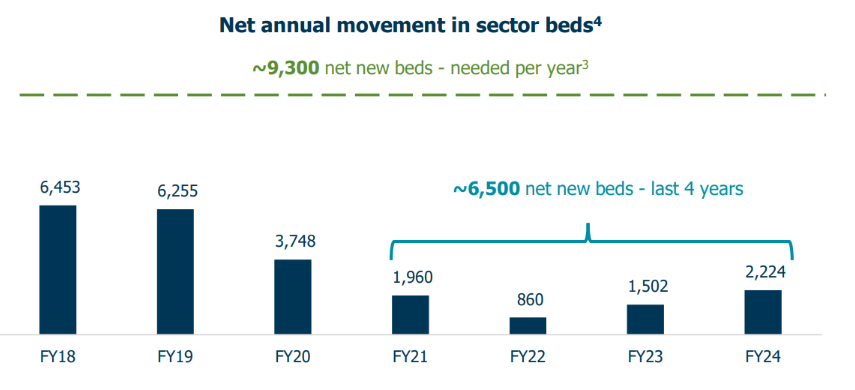 You only have to look at this slide from Regis’ FY25 investor presentation below. In the last four years, just 6,500 new beds have been delivered nationwide – while one-third of stock is in need of replacement. And with Baby Boomers officially hitting residential care age from 2029, the gap is only widening.