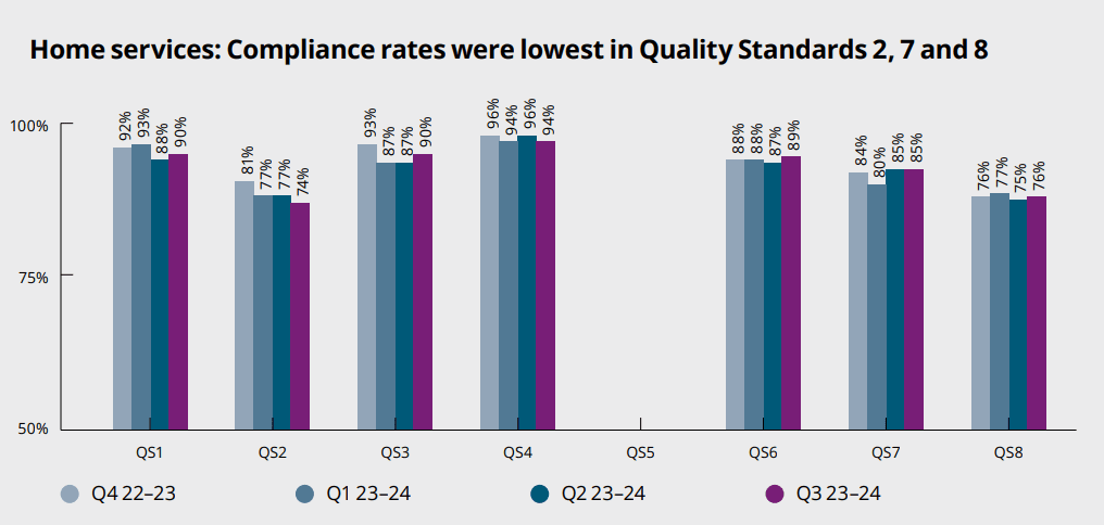 - There is only 76% compliance with Standard 8 (Organisational governance), well below the rate for residential aged care.