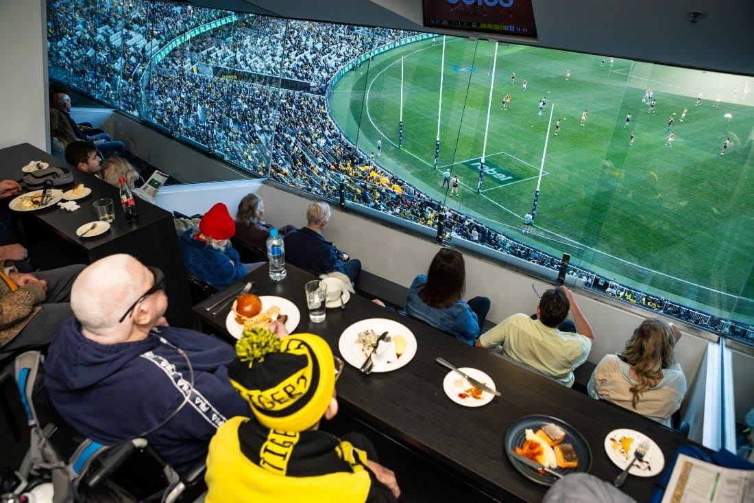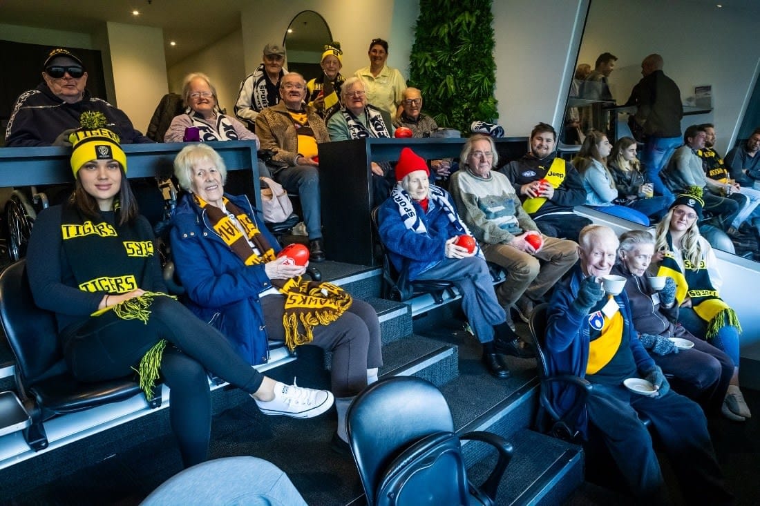 A select group of Estia Health aged care residents have enjoyed a special day out to watch the Richmond Hawthorn AFL match, viewing from the comfort of Foxtel’s private box at the Melbourne Cricket Ground.