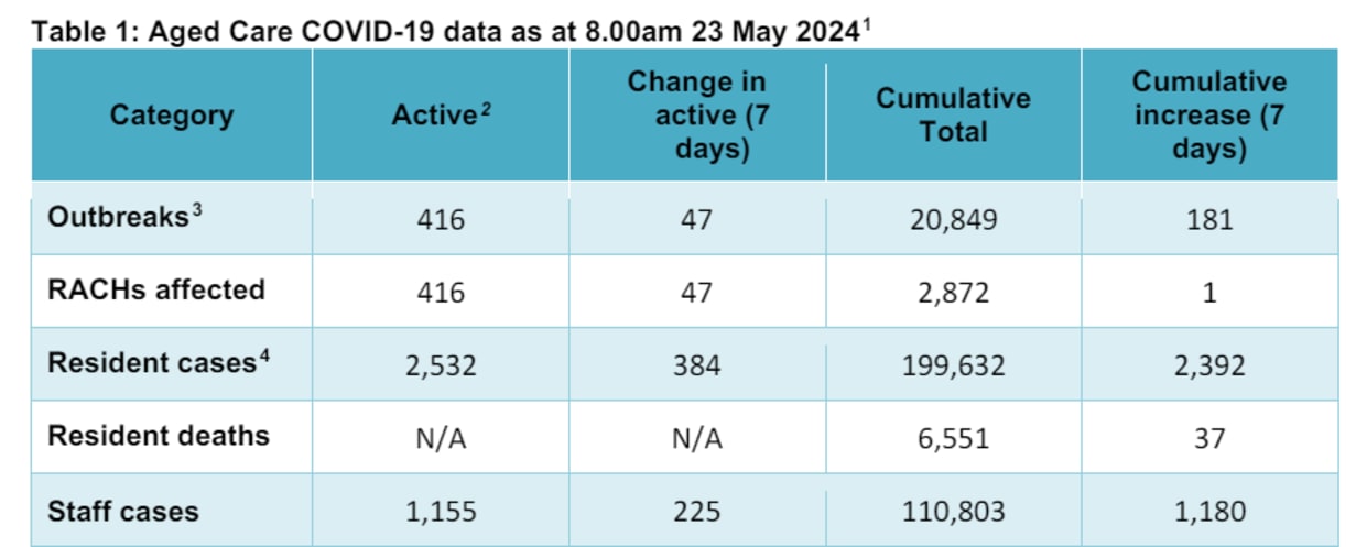 A total of 416 aged care homes were impacted by outbreaks in the week to 23 May, more than 18% of all aged care homes in Australia.
