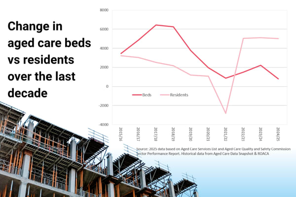 Residential aged care bed growth is being rapidly outpaced by demand, with resident numbers increasing by about 5,000 per year versus just 800 net new beds in 2024-25.