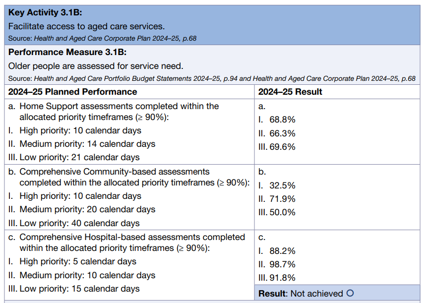 Home care assessments also missed targets more than 30% of the time. By contrast, hospital-based assessments met or almost met their target timeframes – exposing a widening gap between in-hospital and community performance.
