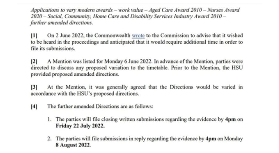 The Fair Work Commission (FWC) has given the new Labor Government until 8 August to make new submissions to the unions’ 25% wage claim for aged care workers – delaying a decision on the case.