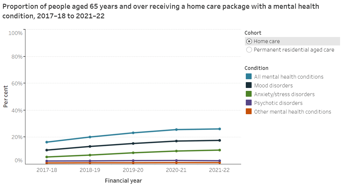 The figure, published in the latest data from the Federal Government's Australian Institute of Health and Welfare (AIHW), has been obtained through aged care assessments data between 1 July 2017 and 30 June 2022, and includes mental health conditions such as mood disorders, anxiety, and psychotic disorders. It does not include dementia. For older people assessed for Home Care, 23.1% recorded a mental health condition in their aged care eligibility assessment when they commenced receiving care.