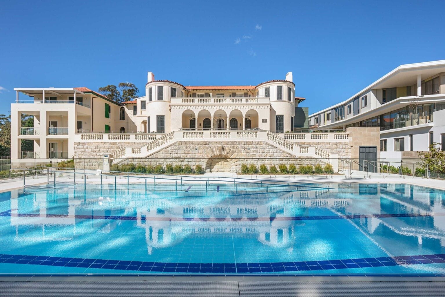 AJC Architects designed Gordon Quarter to complement the estate’s heritage-listed building Burnham Thorpe, with its grand staircase, billiard room, library, sunroom and sweeping terrace, which overlooks a resort-style pool. Roden Cutler Lodge, a residential aged care home, is inside the village.