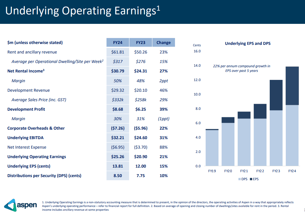 Development profit surged 47% to $12.7 million, with total settled sales rising 14% to 111. Return on invested capital was 18%. The group continues to target households earning under $100,000 a year with a mix of rental, land lease, and residential options. Its rental pool expanded to 4,156 dwellings/sites, up 6% to an average 3,984 across the year. Weekly net rent rose 7%, with average gross rent at $325. By product, residential averaged $365 per week, land lease $213, and parks $343. Aspen said results exceeded guidance, with total income before tax of $77 million and net asset value (excluding Deferred Tax Liability) up 14%. Looking ahead, Aspen expects another strong year, forecasting FY26 operating EBITDA of $47 million – a 14% lift on FY25.