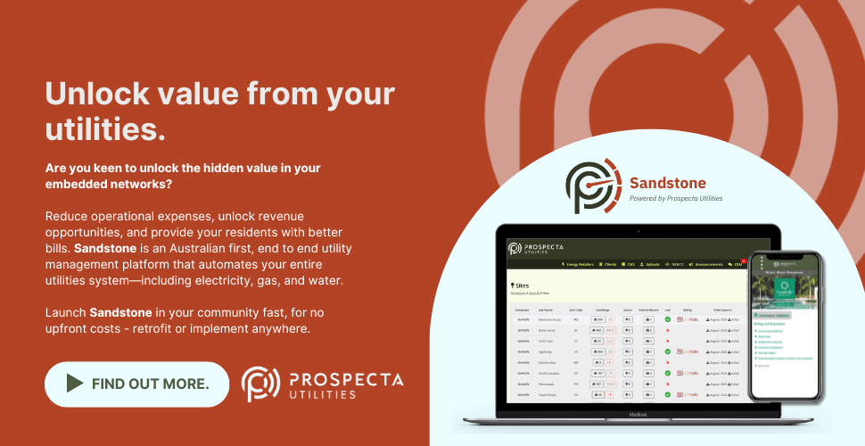 Prospecta offers a comprehensive ‘one-stop shop’ designed to help you achieve improved connectivity, energy efficiency, and financial outcomes. Through embedded networks, solar panels, and battery energy storage systems, Prospecta delivers turn-key solutions that can be installed in both greenfield and brownfield developments. Now, Prospecta introduces Sandstone – Australia’s first fully integrated, end-to-end operations platform for managing embedded network services. Sandstone has revolutionised operations for embedded network operators through its digitised platform, ensuring easy billing and reconciliation, improved customer experience and importantly, a potential reduction in operating costs (with some operators reporting savings of up to 60%) and an uplift in revenue for the operator.