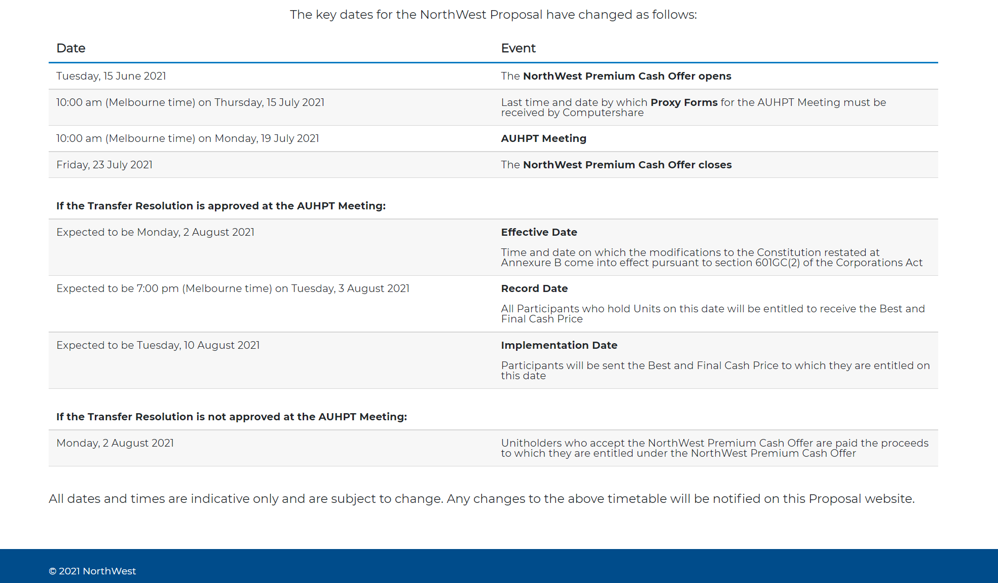 AUSH stated its offer “further demonstrate the Australian Unity Group’s commitment to AUHPT’s portfolio of unique healthcare and medical infrastructure assets that are necessary to support Australia’s future healthcare needs. Additionally, AUFM appreciates that the AUSH PCO may be appealing to some unitholders and AUFM wanted to support a pathway for unitholders who wish to exit their AUHPT investment in whole or part, but who do not want to be required to vote in a particular way on the NorthWest Proposal to do so.”