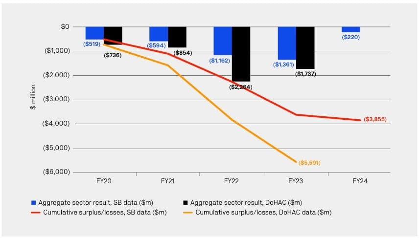 With residential aged care providers losing at least $3.86 billion since 2019-20 (see below), the sector has seen a 36.4% slowdown in building activity in the last four years to just $3.6 billion in 2023-24.