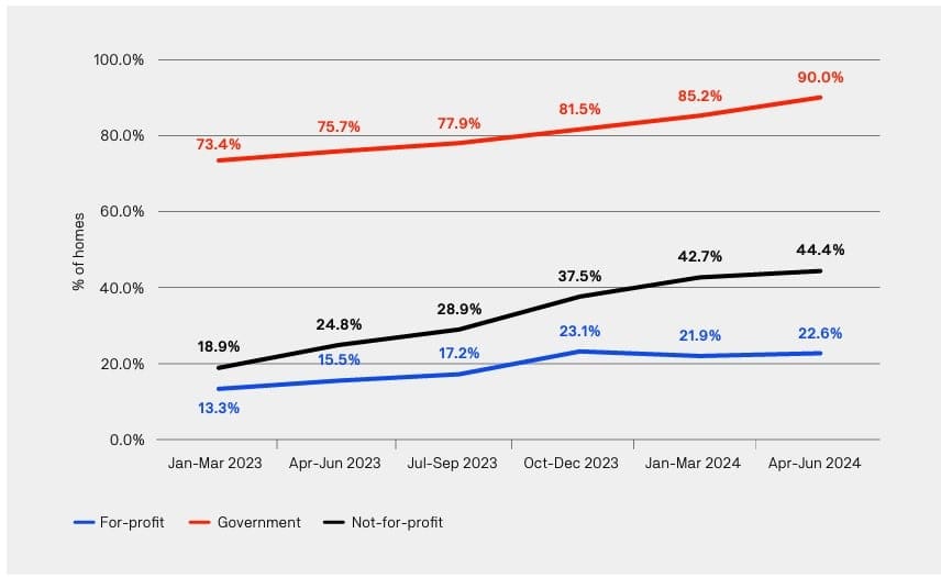 UARC also flags that while the viability of direct care services will likely continue to improve via increases in AN-ACC, the Government and regulator are hardening their expectations that the increased funding is used to meet staffing requirements. As of June 2024, only 40.5% of homes had met both their care minute targets, meaning 59.5% of operators are still below the required staffing levels. Like StewartBrown, the report notes that while the number of Government and Not For Profit homes meeting care minute targets has increased, the compliance rate of For Profit homes has plateaued – see below.