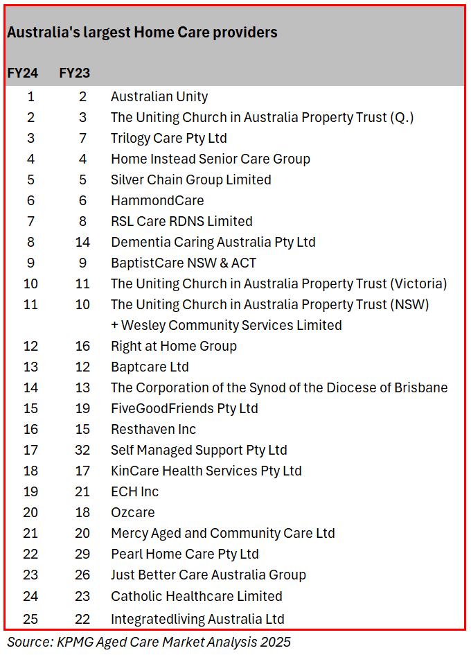 Management consultants KPMG have released their eighth annual analysis of the Australian aged care market, including a ranking of Australia's top 25 home care providers. Topping the list, which is ranked by market share of Home Care Package revenue, this year is Australian Unity, which acquired last year's number one home care provider, my Homecare Group, in March 2024. For Profit self-managed home care provider HomeMade Support was the biggest mover on the list, entering the top 25 for the first time in FY24 at 17th. The operator recorded a 95% increase in revenue from $42 million to $83 million.