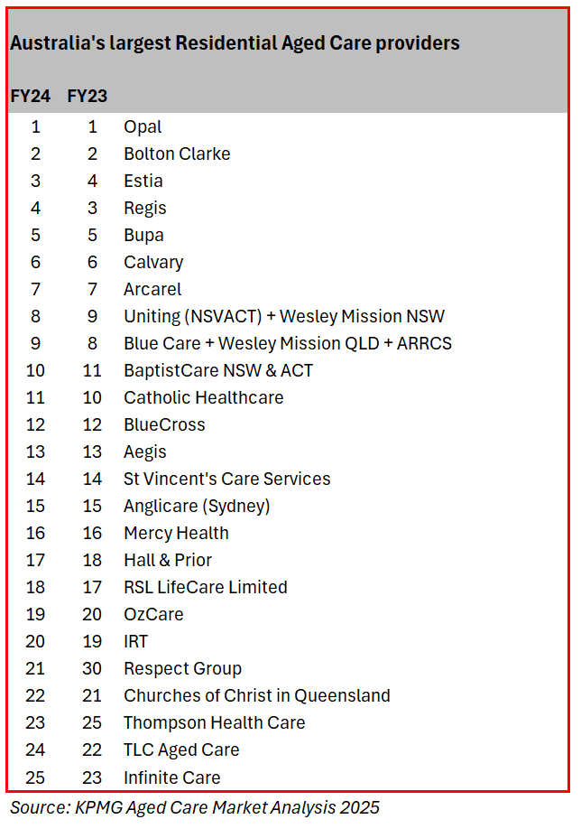 KPMG's eighth annual review of the Australian aged care market features the ranking of the top 25 residential aged care providers, with Opal HealthCare retaining its number one spot.