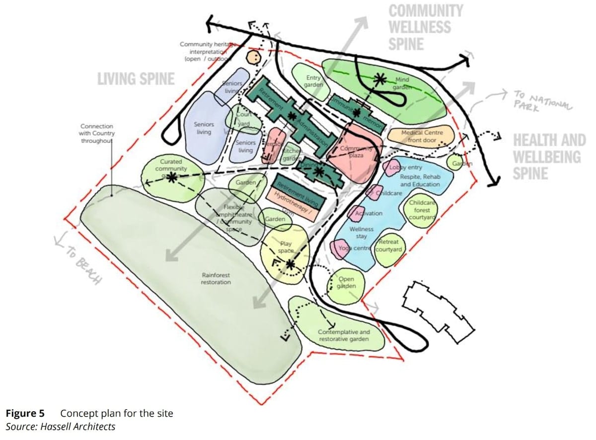 “The Health and Wellbeing Precinct consists of seniors housing, health services facilities as well as a range of other ancillary uses such as community facilities, food and drink premises and a childcare facility,” the Beam Planning Scoping Report states.