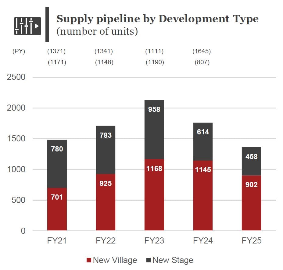While the data shows an increase in development activity in FY22 and FY23 (see chart above), much of the construction is in new stages of existing villages.