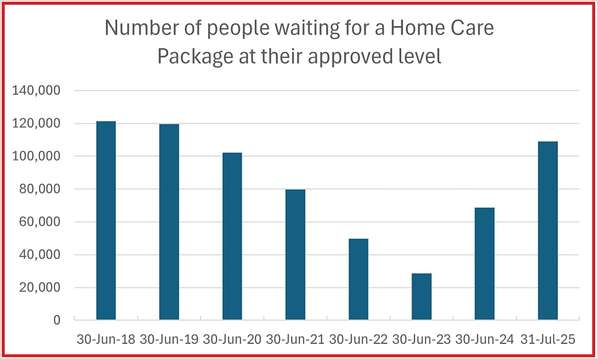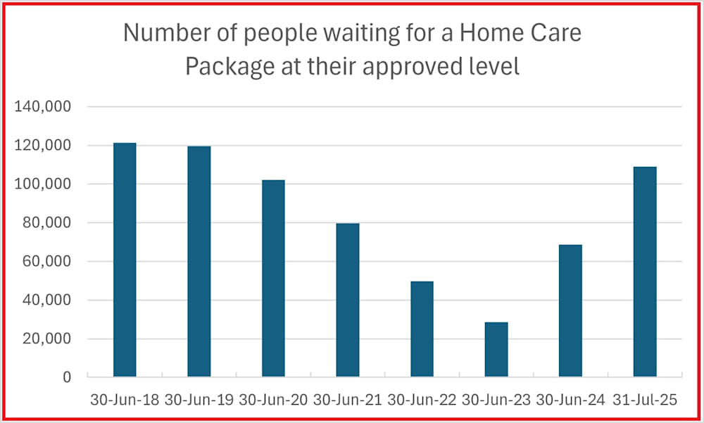But with consumers currently waiting up to 15 months for their approved level of care – and more than 109,000 still in the queue – that target looks increasingly out of reach.