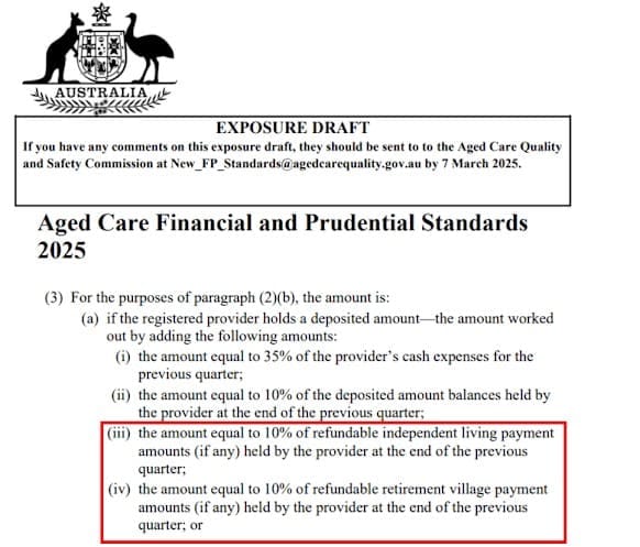 The RLC says this indicates the Commission does not understand the retirement village business model in that the average village resident occupies their home for eight to ten years (or say an average of 10% turnover a year). The operator makes 100% of their income from the DMF when they depart. The Commission’s requirement of retaining 10% equates to one year’s full gross profit before overheads that would need to be siloed off. Operators that would recycle capital into new developments or the next stage of the village would instead be forced to hold onto the cash to meet the Federal requirements, potentially stalling developments and undermining profits. Reading the draft, the aged care services also do not need to be on the same physical site – meaning any operator with both residential aged care and retirement living would be captured under the legislation.