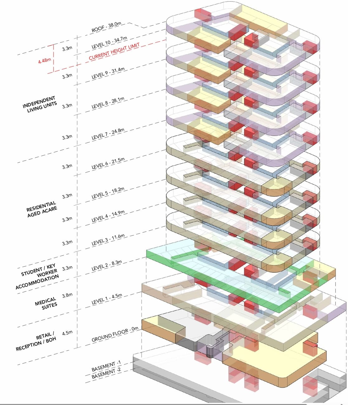 - Level 2: key worker/student apartments (about 2,103m² GBA) plus medical suites.