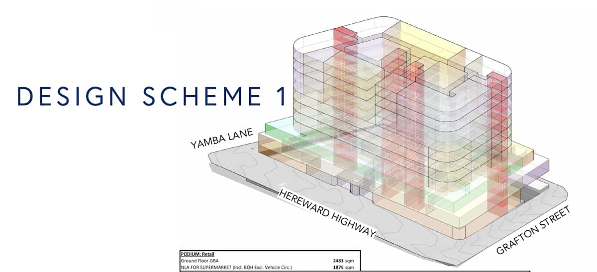 - Ground/Level 1: supermarket, allied health and retail (around 4,967m² of gross building area) with separate retail/medical entries.