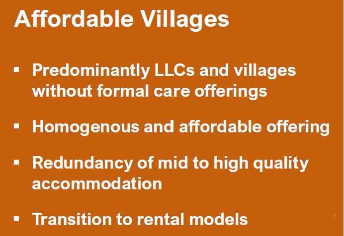 What this tells us, once again, is that village operators will see their business model fundamentally change. Instead of say three employees for a 100 independent resident village, it is likely to be 15 to 50 employees to deliver assisted living.
