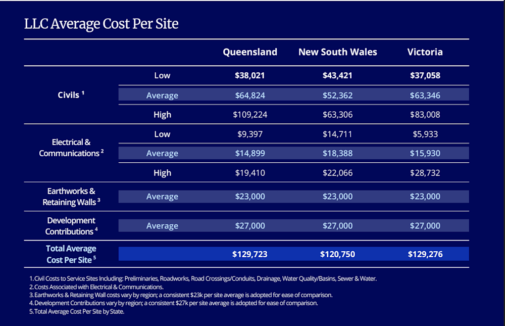 Drawing on feasibility studies and completed projects covering around 3,500 sites across Queensland, New South Wales and Victoria, Colliers reports an average development cost of approximately $127,000 per site.