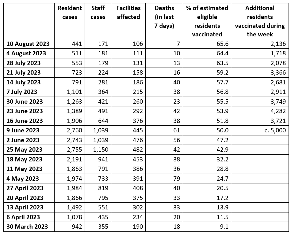 More than 2,000 residents were vaccinated in the week to 10 August 2023, taking the level of fully vaccinated residents to 65.6%.