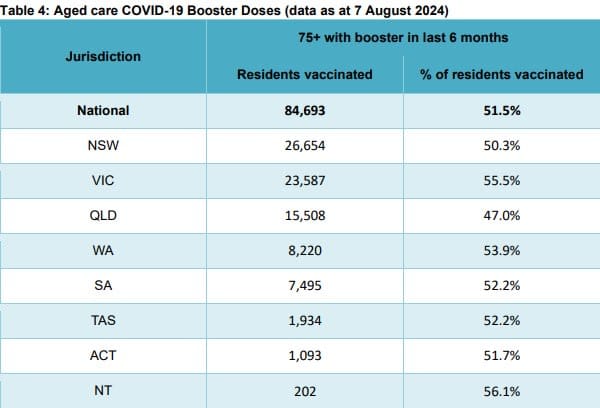 The vaccination rate has increased by more than one-third (34%) since the warning but still nearly half of aged care residents are not vaccinated in line with Australian Government recommendations. For people aged 75 and older, the age of most aged care residents, COVID-19 vaccinations are recommended every six months. In the week to 8 August 2024, more than 1,000 aged care residents contracted COVID-19 , and 21 residents died from the virus. 195 aged care facilities were affected by outbreaks.