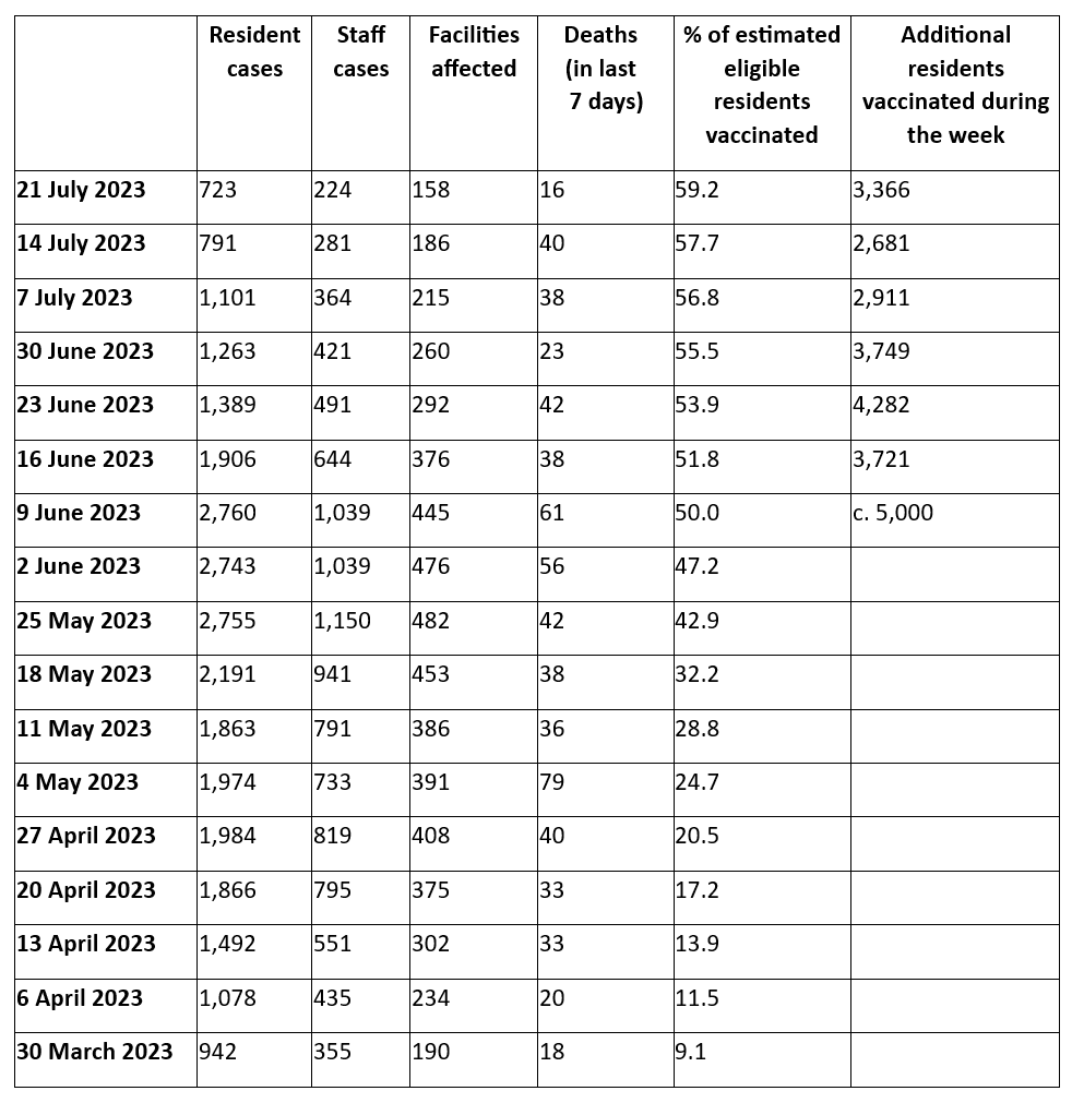 COVID-19 cases in residential aged care continue to ease. However, there are still 158 homes experiencing an outbreak and all the associated challenges that presents, and 16 deaths from the virus were recorded in the week to 21 July 2023.