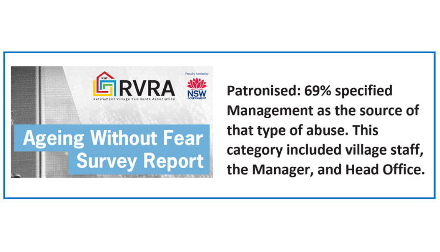 The Retirement Village Residents Association NSW’s Report ‘Ageing Without Fear’ reveals that 40% of village residents have suffered some form of abuse across a sample of 1,259 within 140 retirement villages.