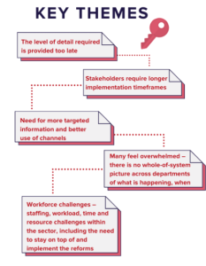 Only 38% of residential aged care providers and 26% of home care providers were “well aware” of the reforms relevant to them. Nearly half – 40% – said they were not getting the level of detail required to plan and prepare for the reform changes. Providers said they are receiving details too late and require more time to implement reforms. Workforce challenges were also identified as a key theme. The second Pulse Survey is available here.