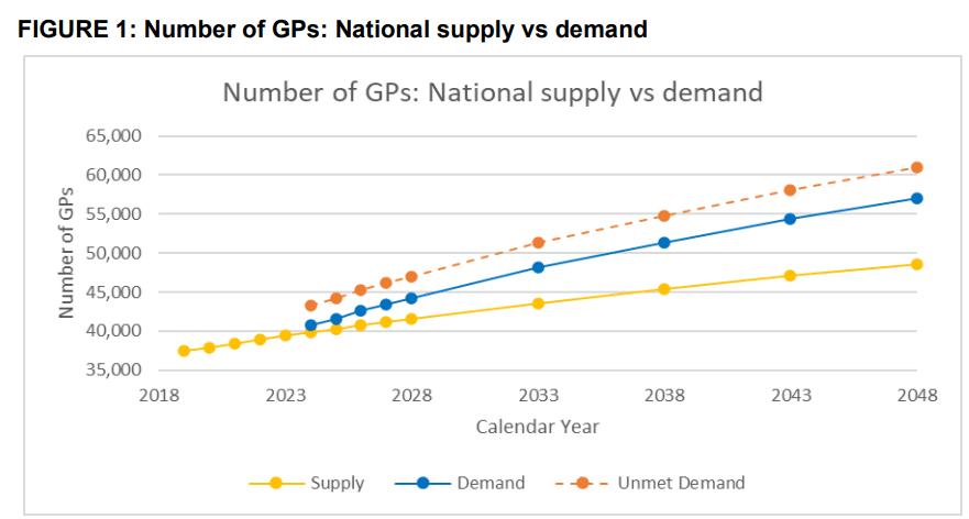 Australian Government forecasts indicate Australia already has a shortage of GPs, and the nation's ageing population and high incidences of chronic disease mean the shortage will only worsen. The Department of Health and Aged Care's Supply and Demand Study for GPs in Australia, released in August, estimates there will be a shortfall of more than 600 FTE GPs in 2024, increasing to more than 1,900 FTE in 2028, and 6,100 FTE by 2048. This equates to a shortfall in the number of GPs of more than 800 in 2024, more than 2,600 by 2028, and by 2048 there will be a shortage of 8,600 GPs.
