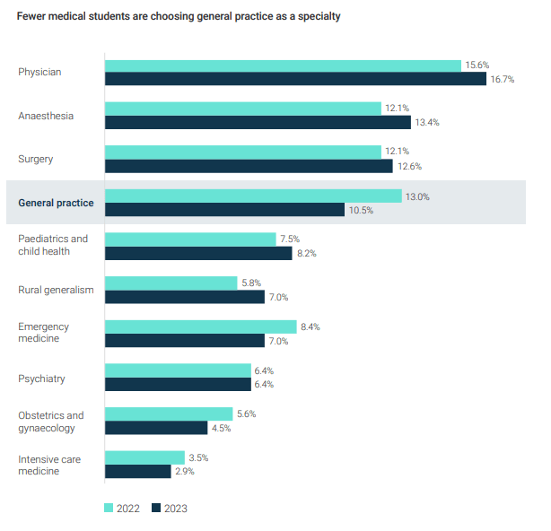 Data on medical student numbers provides little in the way of hope. The percentage of medical students choosing general practice as a specialisation fell from 13% in 2022 to 10.5% in 2023, the RACGP survey shows.