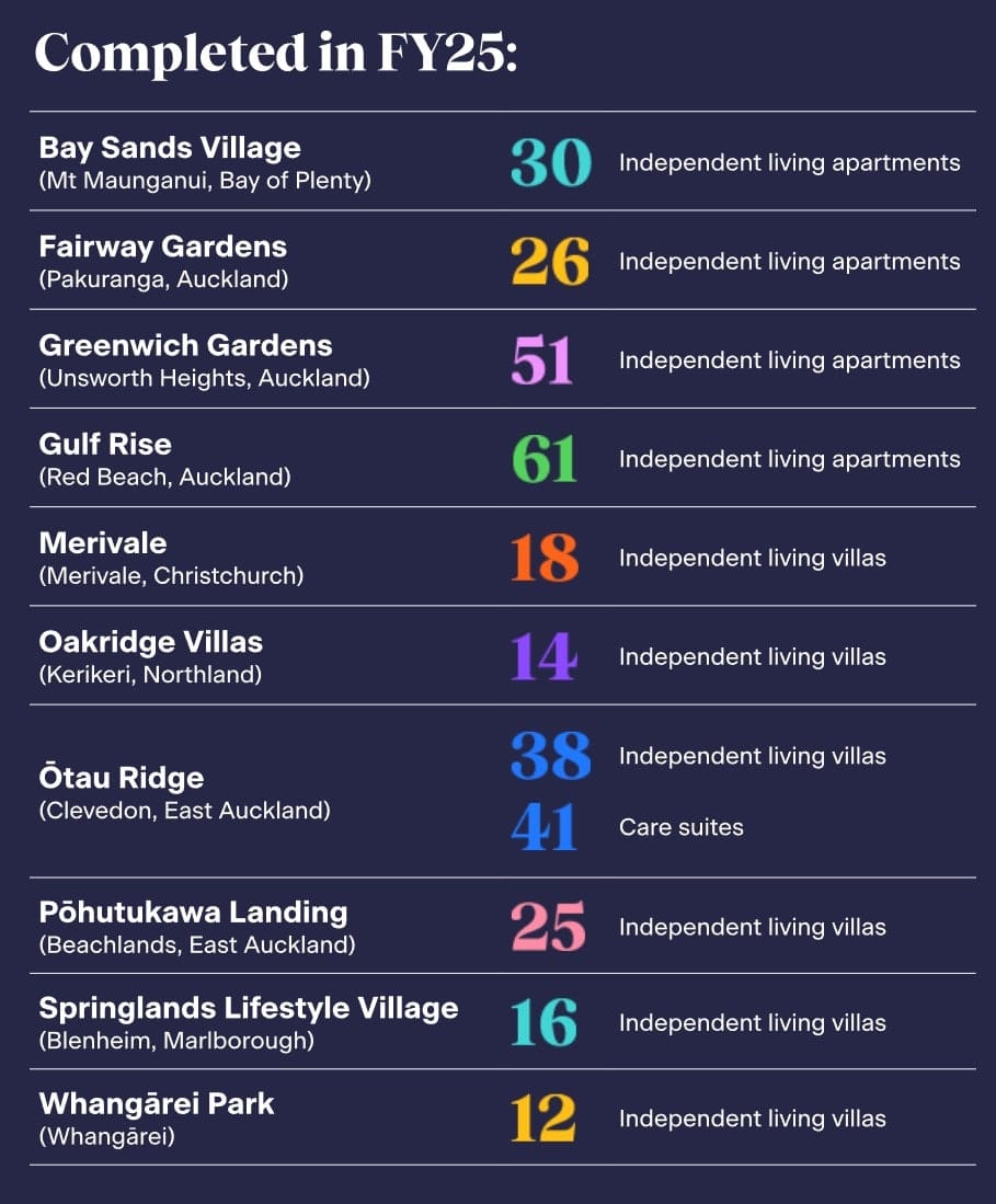 During FY25, Metlifecare completed new units and care suites across 10 villages and is on track to open three new villages in FY26 at Mangawhai (north of Auckland), Rototuna (Waikato) and Wānaka (Central Otago).
