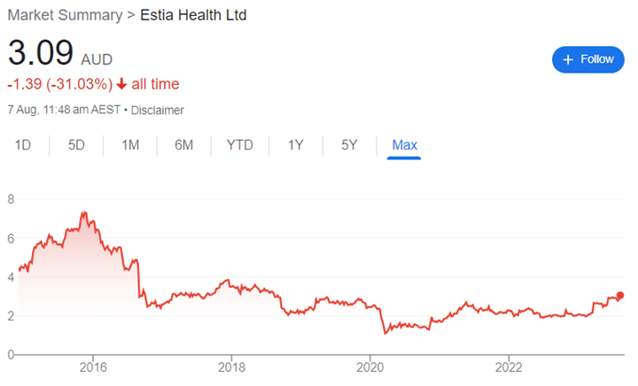 Estia Health shares were trading at $3.09 as of 1pm 7 August 2023 – almost a five-year high for the stock.