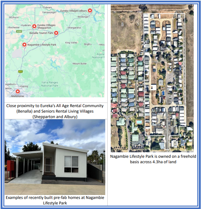 Eureka informed the ASX it has agreed to acquire Nagambie Lifestyle Park (Nagambie Caravan Park) in the township on the Goulburn River in central northern Victoria, for $11 million.