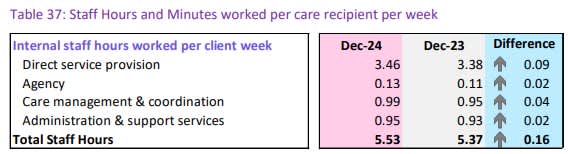 StewartBrown points out this figure is still significantly below the average nine hours per client per week provided prior to the implementation of the Consumer Directed Care model in 2015. Consumer contributions to home care also remain low and represent less than 2.4% of the overall funding envelope.